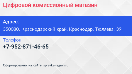 Цифровой, комиссионный магазин по адресу 350080, Краснодарский край, Краснодар, Тюляева, 39 в дальнейшем Организация, размещена в следующих категориях: