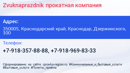 Zvuknaprazdnik, прокатная компания по адресу 350005, Краснодарский край, Краснодар, Дзержинского, 100 в дальнейшем Организация, размещена в следующих категориях: