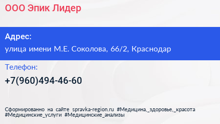 ООО «Эпик Лидер» по адресу улица имени М.Е. Соколова, 66/2, Краснодар в дальнейшем Организация, размещена в следующих категориях: