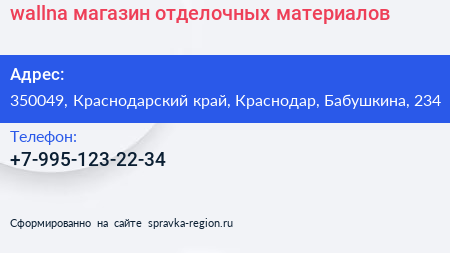 wallna, магазин отделочных материалов по адресу 350049, Краснодарский край, Краснодар, Бабушкина, 234 в дальнейшем Организация, размещена в следующих категориях: