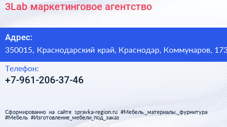 3Lab, маркетинговое агентство по адресу 350015, Краснодарский край, Краснодар, Коммунаров, 173 в дальнейшем Организация, размещена в следующих категориях: