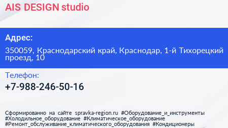 AIS DESIGN studio по адресу 350059, Краснодарский край, Краснодар, 1-й Тихорецкий проезд, 10 в дальнейшем Организация, размещена в следующих категориях: