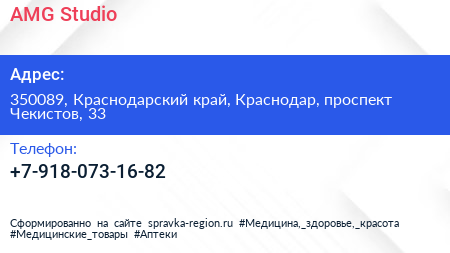 AMG Studio по адресу 350089, Краснодарский край, Краснодар, проспект Чекистов, 33 в дальнейшем Организация, размещена в следующих категориях: