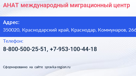 АНАТ, международный миграционный центр по адресу 350020, Краснодарский край, Краснодар, Коммунаров, 266 в дальнейшем Организация, размещена в следующих категориях: