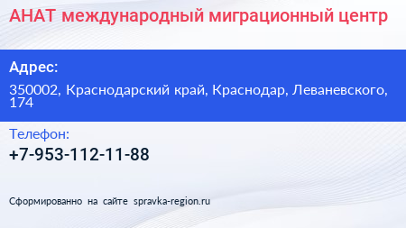 АНАТ, международный миграционный центр по адресу 350002, Краснодарский край, Краснодар, Леваневского, 174 в дальнейшем Организация, размещена в следующих категориях: