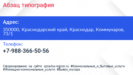 Абзац, типография по адресу 350000, Краснодарский край, Краснодар, Коммунаров, 73/1 в дальнейшем Организация, размещена в следующих категориях: