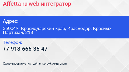 Affetta.ru, web-интегратор по адресу 350049, Краснодарский край, Краснодар, Красных Партизан, 218 в дальнейшем Организация, размещена в следующих категориях:
