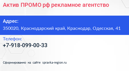 Актив-ПРОМО.рф, рекламное агентство по адресу 350020, Краснодарский край, Краснодар, Одесская, 41 в дальнейшем Организация, размещена в следующих категориях: