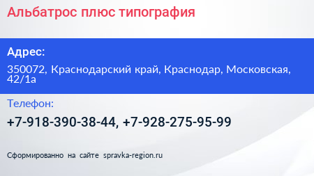 Альбатрос плюс, типография по адресу 350072, Краснодарский край, Краснодар, Московская, 42/1а в дальнейшем Организация, размещена в следующих категориях: