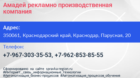 Амадей, рекламно-производственная компания по адресу 350061, Краснодарский край, Краснодар, Парусная, 20 в дальнейшем Организация, размещена в следующих категориях: