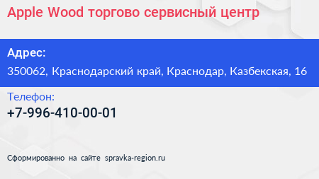 Apple Wood, торгово-сервисный центр по адресу 350062, Краснодарский край, Краснодар, Казбекская, 16 в дальнейшем Организация, размещена в следующих категориях: