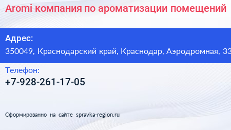 Aromi, компания по ароматизации помещений по адресу 350049, Краснодарский край, Краснодар, Аэродромная, 33 в дальнейшем Организация, размещена в следующих категориях: