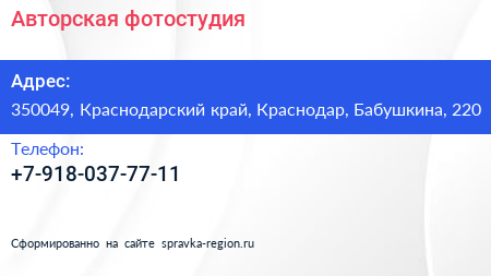 Авторская, фотостудия по адресу 350049, Краснодарский край, Краснодар, Бабушкина, 220 в дальнейшем Организация, размещена в следующих категориях: