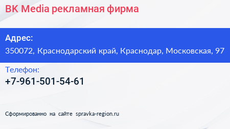 BK-Media, рекламная фирма по адресу 350072, Краснодарский край, Краснодар, Московская, 97 в дальнейшем Организация, размещена в следующих категориях: