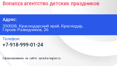 Bonanza, агентство детских праздников по адресу 350028, Краснодарский край, Краснодар, Героев-Разведчиков, 26 в дальнейшем Организация, размещена в следующих категориях: