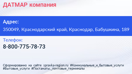 ДАТМАР, компания по адресу 350049, Краснодарский край, Краснодар, Бабушкина, 189 в дальнейшем Организация, размещена в следующих категориях: