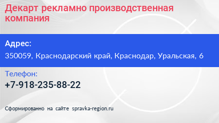 Декарт, рекламно-производственная компания по адресу 350059, Краснодарский край, Краснодар, Уральская, 6 в дальнейшем Организация, размещена в следующих категориях: