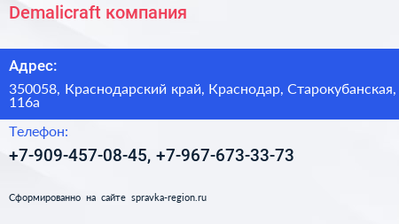 Demalicraft, компания по адресу 350058, Краснодарский край, Краснодар, Старокубанская, 116а в дальнейшем Организация, размещена в следующих категориях: