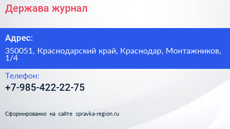 Держава, журнал по адресу 350051, Краснодарский край, Краснодар, Монтажников, 1/4 в дальнейшем Организация, размещена в следующих категориях: