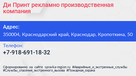 Ди-Принт, рекламно-производственная компания по адресу 350004, Краснодарский край, Краснодар, Кропоткина, 50 в дальнейшем Организация, размещена в следующих категориях: