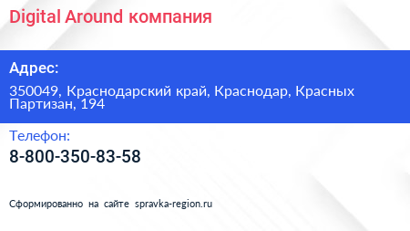 Digital Around, компания по адресу 350049, Краснодарский край, Краснодар, Красных Партизан, 194 в дальнейшем Организация, размещена в следующих категориях: