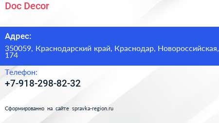 Doc Decor по адресу 350059, Краснодарский край, Краснодар, Новороссийская, 174 в дальнейшем Организация, размещена в следующих категориях: