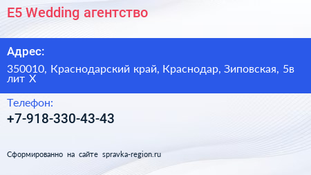 E5 Wedding, агентство по адресу 350010, Краснодарский край, Краснодар, Зиповская, 5в лит Х в дальнейшем Организация, размещена в следующих категориях: