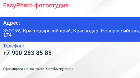 EasyPhoto, фотостудия по адресу 350059, Краснодарский край, Краснодар, Новороссийская, 174 в дальнейшем Организация, размещена в следующих категориях: