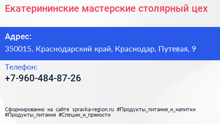 Екатерининские мастерские, столярный цех по адресу 350015, Краснодарский край, Краснодар, Путевая, 9 в дальнейшем Организация, размещена в следующих категориях: