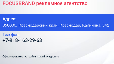 FOCUSBRAND, рекламное агентство по адресу 350000, Краснодарский край, Краснодар, Калинина, 341 в дальнейшем Организация, размещена в следующих категориях: