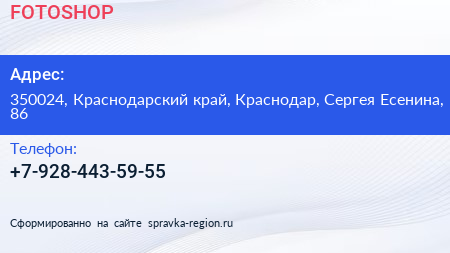 FOTOSHOP по адресу 350024, Краснодарский край, Краснодар, Сергея Есенина, 86 в дальнейшем Организация, размещена в следующих категориях: