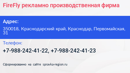 FireFly, рекламно-производственная фирма по адресу 350018, Краснодарский край, Краснодар, Первомайская, 31 в дальнейшем Организация, размещена в следующих категориях: