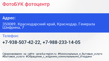 ФотоБУК, фотоцентр по адресу 350089, Краснодарский край, Краснодар, Генерала Шифрина, 7 в дальнейшем Организация, размещена в следующих категориях: