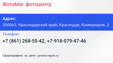 ФотоМаг, фотоцентр по адресу 350063, Краснодарский край, Краснодар, Коммунаров, 2 в дальнейшем Организация, размещена в следующих категориях: