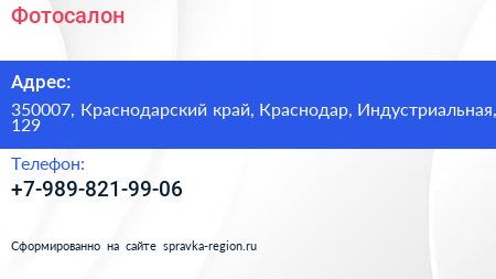 Фотосалон по адресу 350007, Краснодарский край, Краснодар, Индустриальная, 129 в дальнейшем Организация, размещена в следующих категориях: