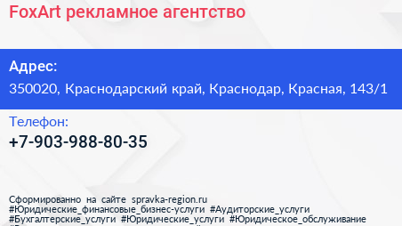 FoxArt, рекламное агентство по адресу 350020, Краснодарский край, Краснодар, Красная, 143/1 в дальнейшем Организация, размещена в следующих категориях: