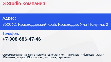 G-Studio, компания по адресу 350062, Краснодарский край, Краснодар, Яна Полуяна, 2 в дальнейшем Организация, размещена в следующих категориях: