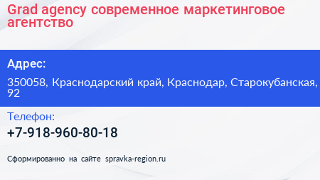 Grad agency, современное маркетинговое агентство по адресу 350058, Краснодарский край, Краснодар, Старокубанская, 92 в дальнейшем Организация, размещена в следующих категориях: