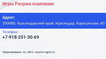 Игры Разума, компания по адресу 350000, Краснодарский край, Краснодар, Карасунская, 60 в дальнейшем Организация, размещена в следующих категориях: