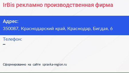 IrBis, рекламно-производственная фирма по адресу 350087, Краснодарский край, Краснодар, Бигдая, 6 в дальнейшем Организация, размещена в следующих категориях: