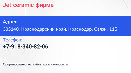 Jet-ceramic, фирма по адресу 385140, Краснодарский край, Краснодар, Связи, 11Б в дальнейшем Организация, размещена в следующих категориях: