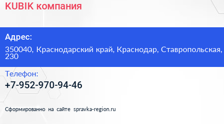 KUBIK, компания по адресу 350040, Краснодарский край, Краснодар, Ставропольская, 230 в дальнейшем Организация, размещена в следующих категориях: