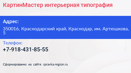 КартинМастер, интерьерная типография по адресу 350016, Краснодарский край, Краснодар, им. Артюшкова, 5 в дальнейшем Организация, размещена в следующих категориях: