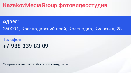 KazakovMediaGroup, фотовидеостудия по адресу 350004, Краснодарский край, Краснодар, Киевская, 28 в дальнейшем Организация, размещена в следующих категориях: