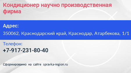 Кондиционер, научно-производственная фирма по адресу 350062, Краснодарский край, Краснодар, Атарбекова, 1/1 в дальнейшем Организация, размещена в следующих категориях:
