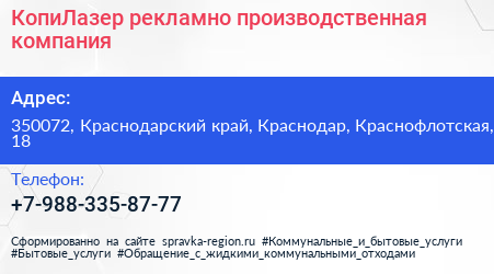 КопиЛазер, рекламно-производственная компания по адресу 350072, Краснодарский край, Краснодар, Краснофлотская, 18 в дальнейшем Организация, размещена в следующих категориях: