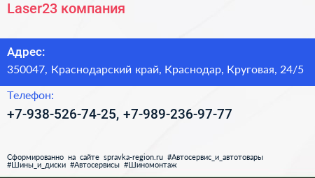 Laser23, компания по адресу 350047, Краснодарский край, Краснодар, Круговая, 24/5 в дальнейшем Организация, размещена в следующих категориях: