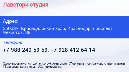 Лавстори, студия по адресу 350089, Краснодарский край, Краснодар, проспект Чекистов, 38 в дальнейшем Организация, размещена в следующих категориях:
