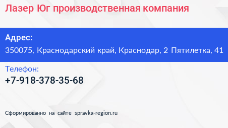 Лазер-Юг, производственная компания по адресу 350075, Краснодарский край, Краснодар, 2 Пятилетка, 41 в дальнейшем Организация, размещена в следующих категориях: