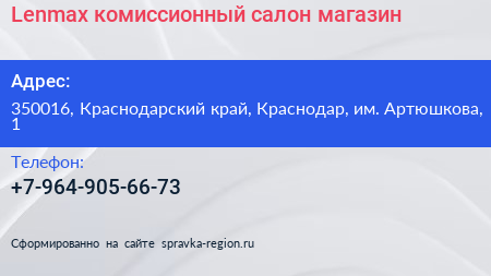 Lenmax, комиссионный салон-магазин по адресу 350016, Краснодарский край, Краснодар, им. Артюшкова, 1 в дальнейшем Организация, размещена в следующих категориях: